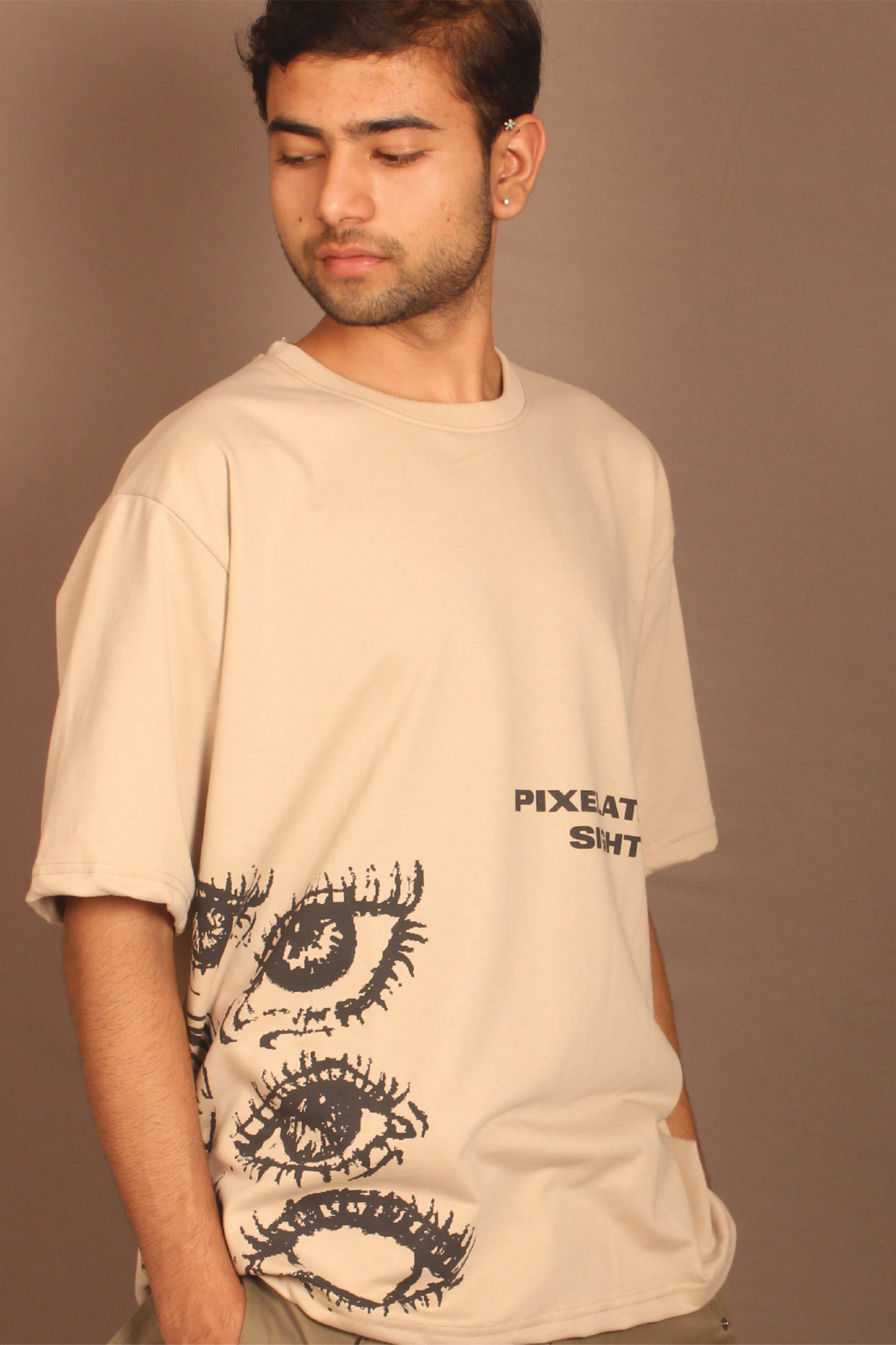Light fawn-coloured drop shoulder t-shirt with label on the front and 'PIXELATED SIGHT' print.